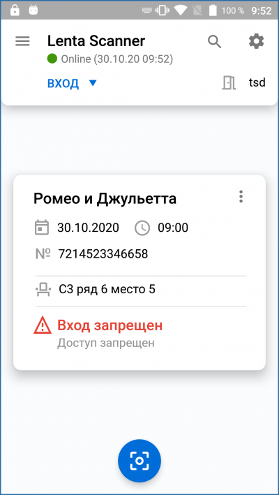 После считывания штрихкода билета на экране отобразится сообщение о разрешении или запрете доступа.