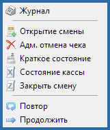 Для открытия фискальной смены выберите соответствующий пункт в меню «Фискальный регистратор».