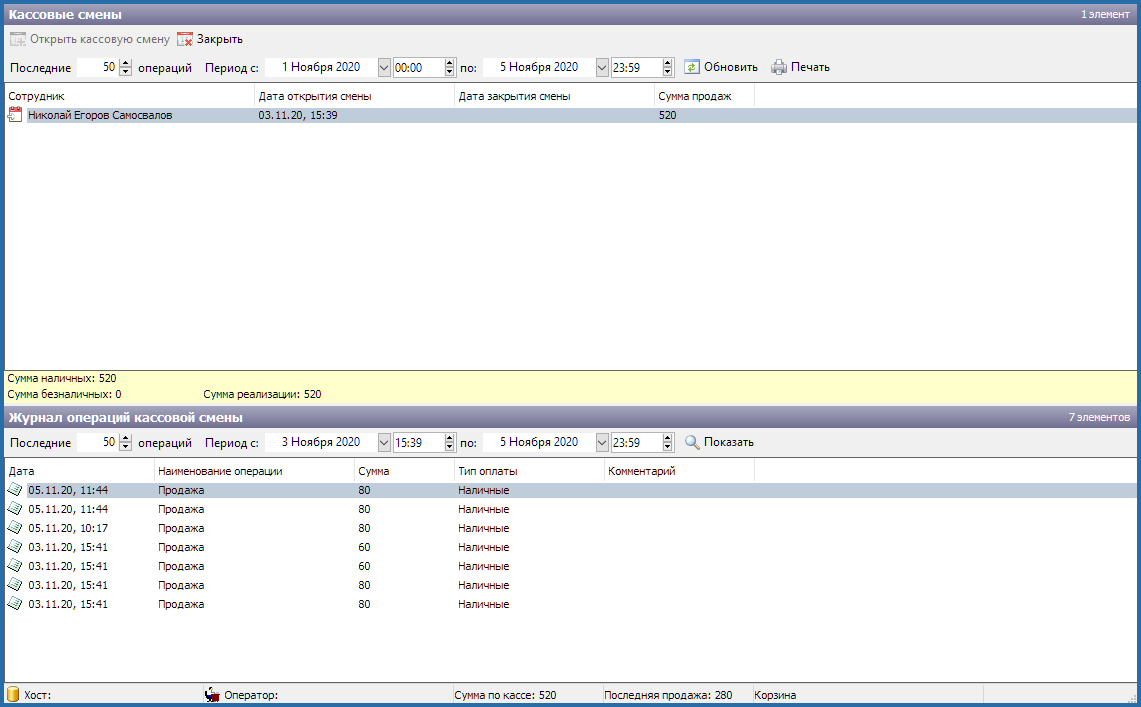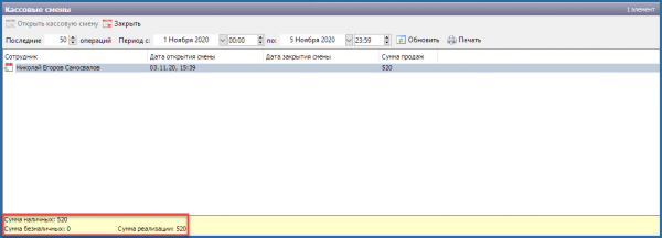 - Дата открытия и закрытия смены