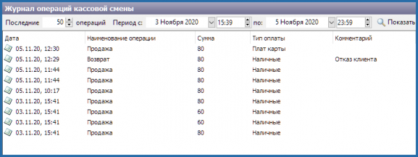 На вкладке «Журнал операций кассовой смены» отображаются все операции (продажа, возврат и т.д.) выбранной кассовой смены.