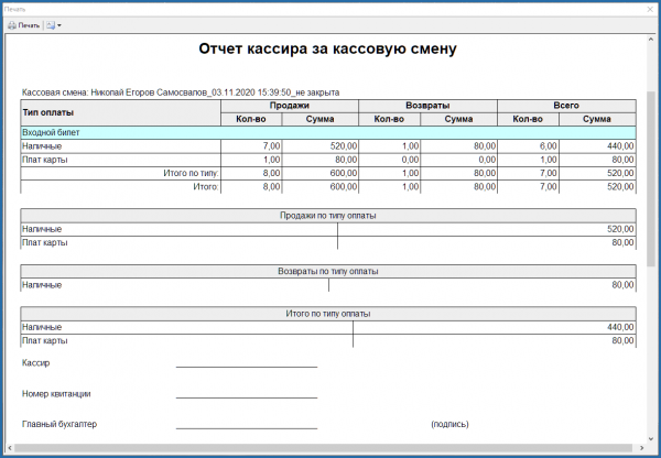 - Сумма реализации - сумма реализации равняется сумме продаж. Сумма реализации складывается из продаж билетов и их возвратов. В сумме реализации не учитывается внесение денег и их изъятие из кассы