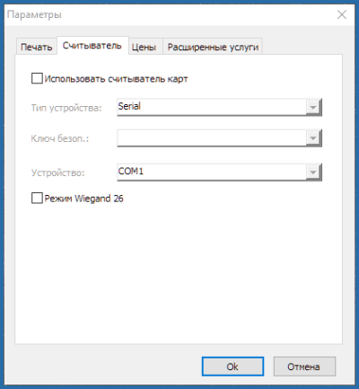 - В окне отметьте «Использовать считыватель карт», выберите тип устройства «Serial», укажите используемый порт считывателя карт и нажмите кнопку «Оk». Для активации Режима считывания Wiegand 26, отметьте галочкой «Режим Wiegand 26» и нажмите кнопку «Оk». Режим Wiegand 26 обнуляет последние 2 цифры кода карты. При обычном режиме код карты выглядит: Mifare[С957FF14], при режиме Wiegand 26 он выглядел бы: Mifare[С957FF00]