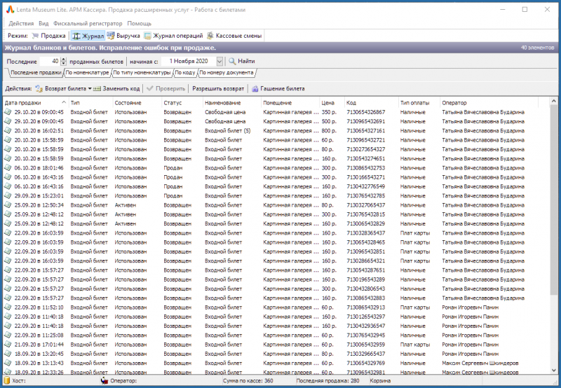 - по типу номенклатуры - поиск билета по типу проданной номенклатуры (входной билет, прочие товары, прочие услуги)