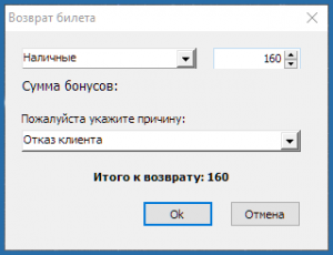 - Возврат билета – билет изменит свой статус на «Возвращен» и станет недействительным. При возврате билета в окне отображаются типы оплаты и суммы, которыми оплатили билет.