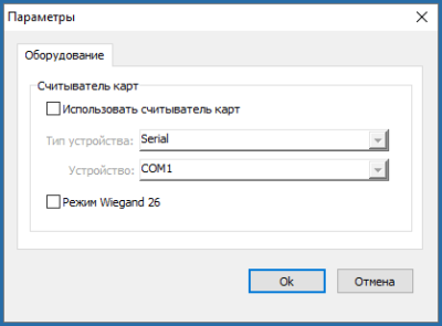 Войдите в меню «Действия», нажмите кнопку «Параметры». В появившемся окне отметьте «Использовать считыватель карт», выберите тип устройства «Serial», укажите используемый порт считывателя карт и нажмите кнопку «Оk». Для активации Режима считывания Wiegand 26, отметьте галочкой «Режим Wiegand 26» и нажмите кнопку «Оk».