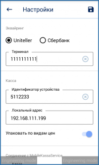 В нем вводятся данные устройства и данные для подключения к службе MobileKassaService.