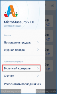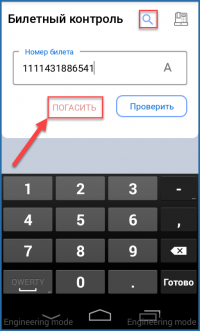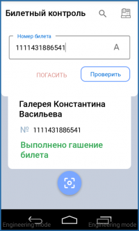 Для гашения билетов необходимо выбрать пункт «Билетный контроль» в боковом меню или нажать кнопку на главном экране приложения.